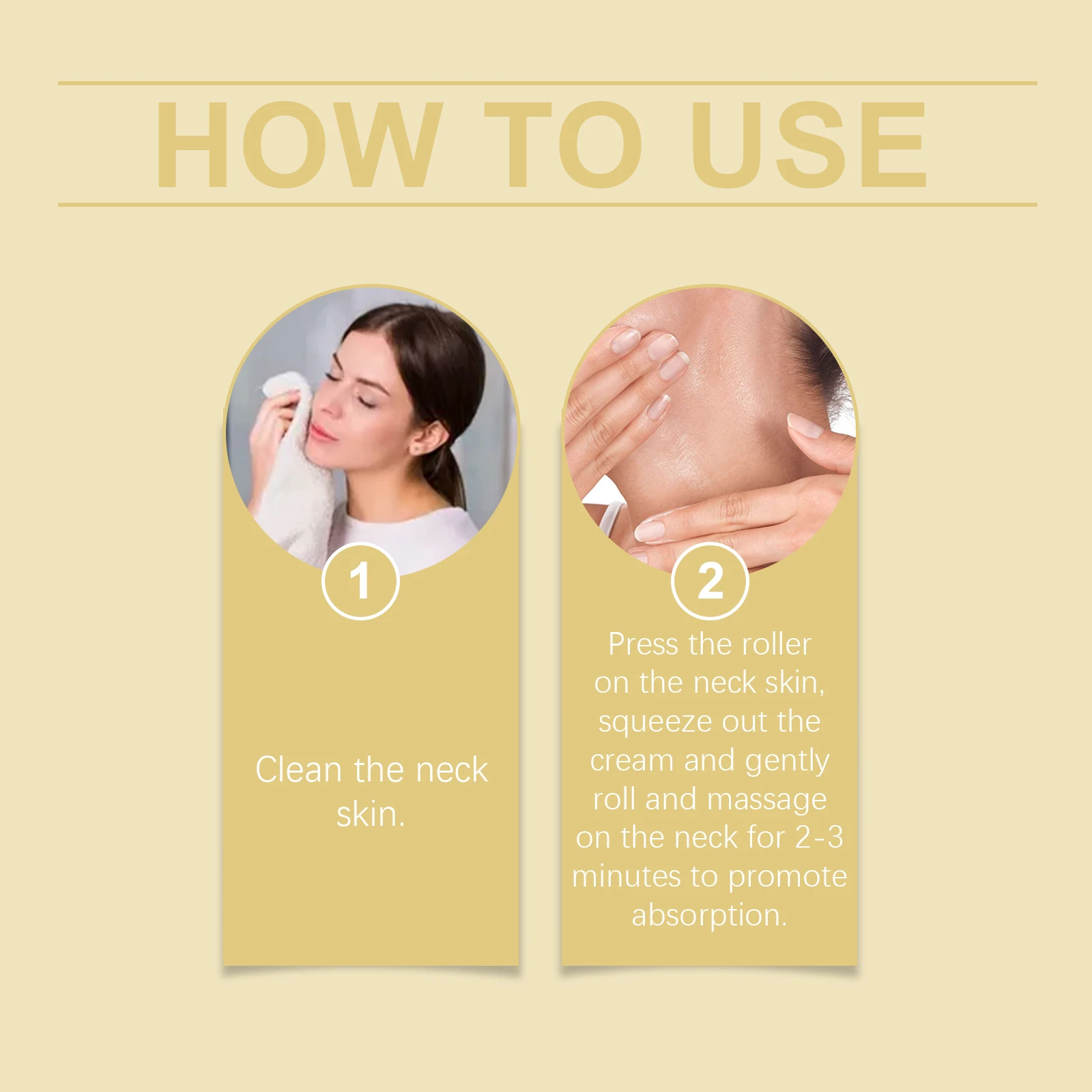 2.Press the roller on the neck skin, squeeze out the cream and gently roll and massage on the neck for 2-3minutes to promote absorption.